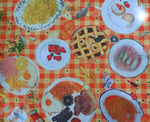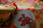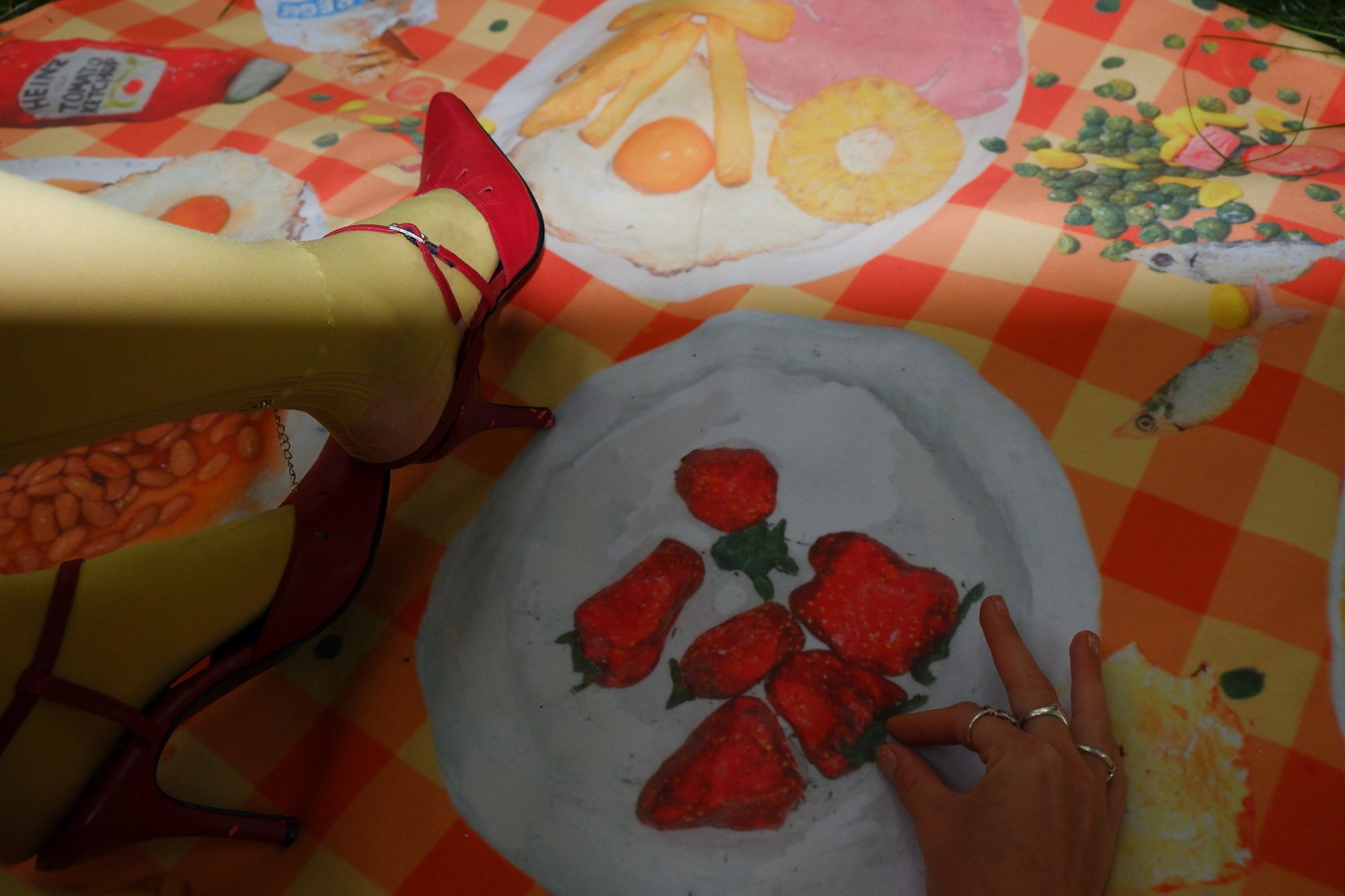 Fleece picnic blanket with waterproof base, featuring clay food sculptures by Harriet Hammond
